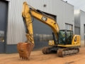 The machine is powered by a Caterpillar C4.4 engine delivering 91 kW and complies with EU Stage IV emission standards. A bucket with teeth is included, making this excavator suitable for a wide range of excavation and earthmoving applications.